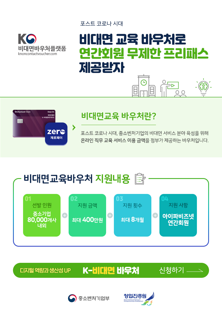 중고벤처기업의 비대면 서비스 분야 육성을 위해 온라인 직무 교육 서비스 이용 금액을 정부가 제공하는 바우처입니다.